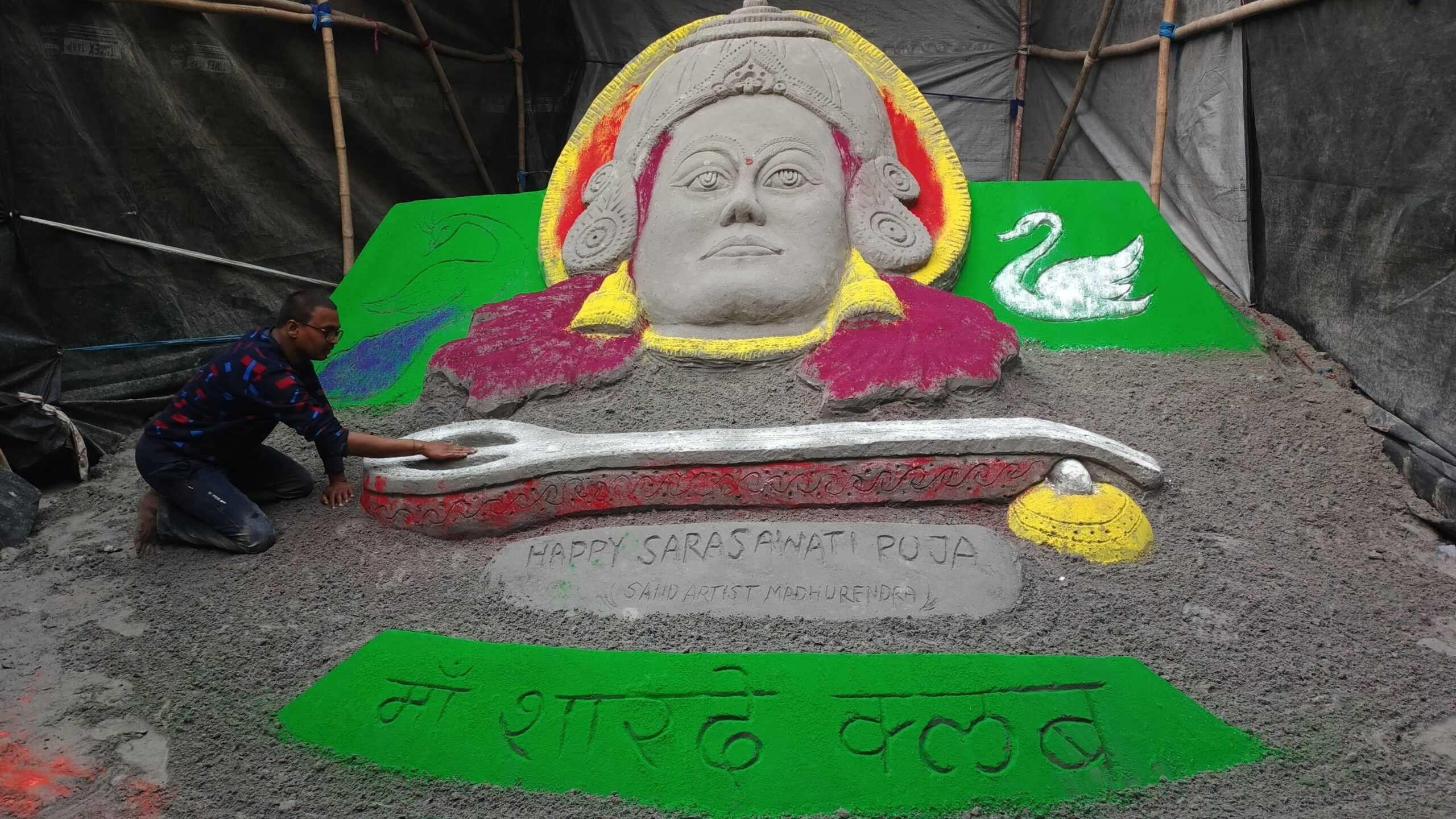 कहलगांव में अनोखी सरस्वती पूजा: सैंड आर्टिस्ट मधुरेंद्र ने 20 टन कोयले की राख से बनाई मां शारदे की भव्य आकृति